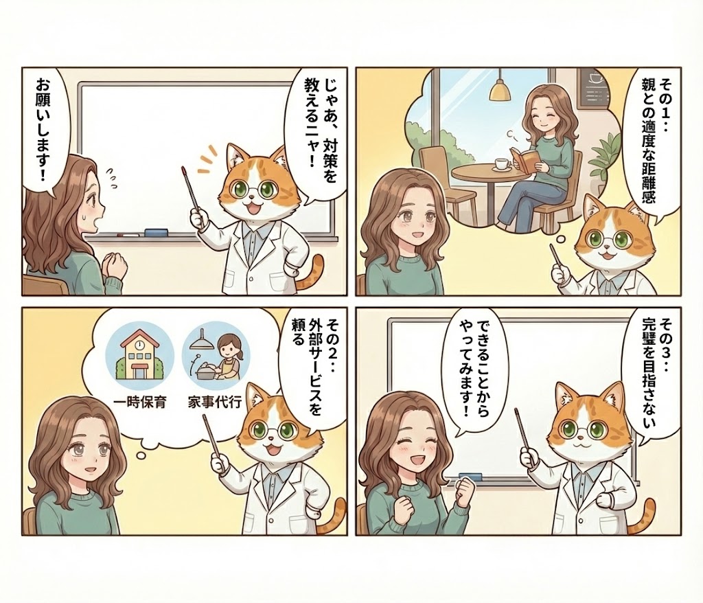 あなたの親との関係性を理解し、必要であれば「適度な距離(スープの冷めない距離)」を保つことに協力的な人を選ばなければ、また同じストレスのループにハマってしまうにゃ。