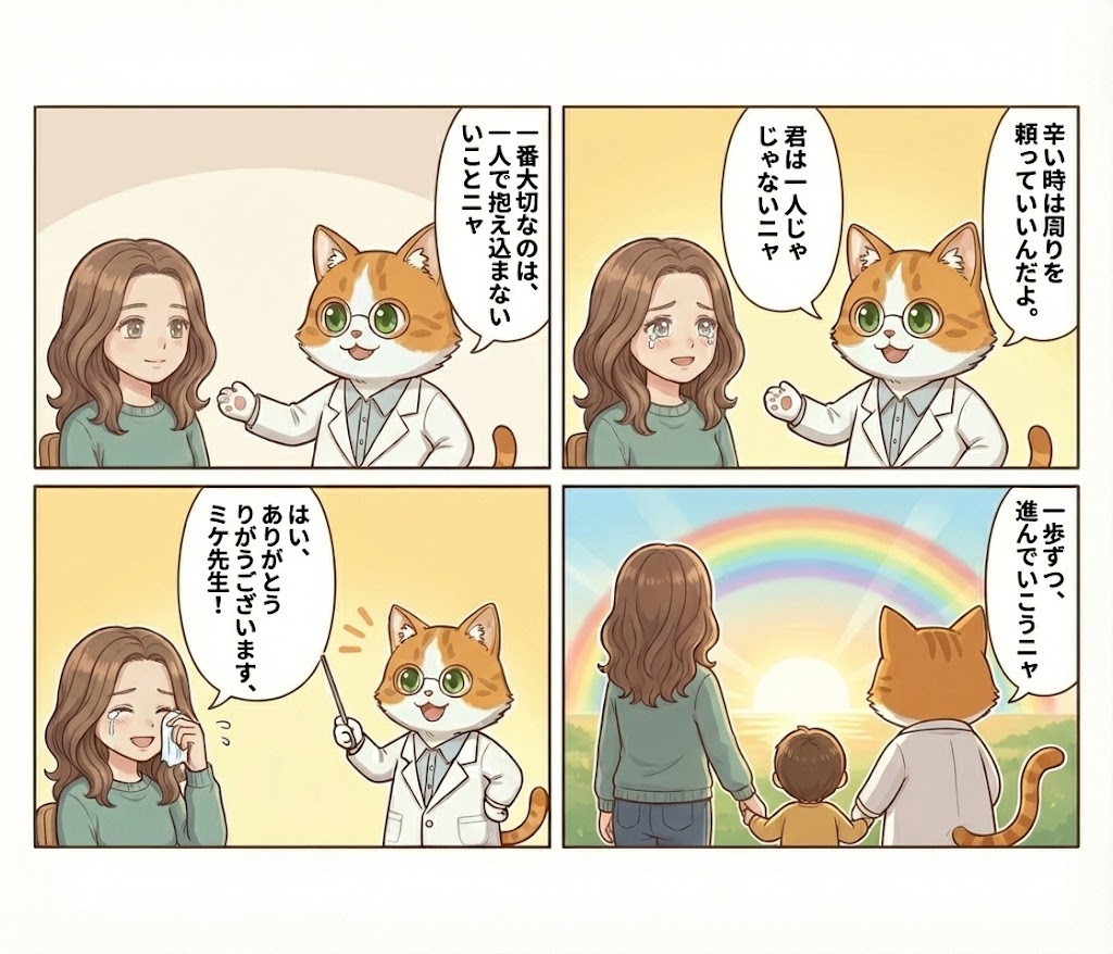 一人の力で全てを解決しようとしなくていいんだにゃ。時には公的な支援を頼り、時には新しいパートナーの手に甘える。それは決して恥ずかしいことではありません。